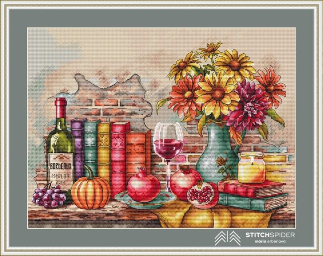 This cross-stitch pattern blends autumn warmth, wine aroma, rustling books, bright flowers and the richness of ripe grapes, pumpkins and pomegranates into one cozy scene.
